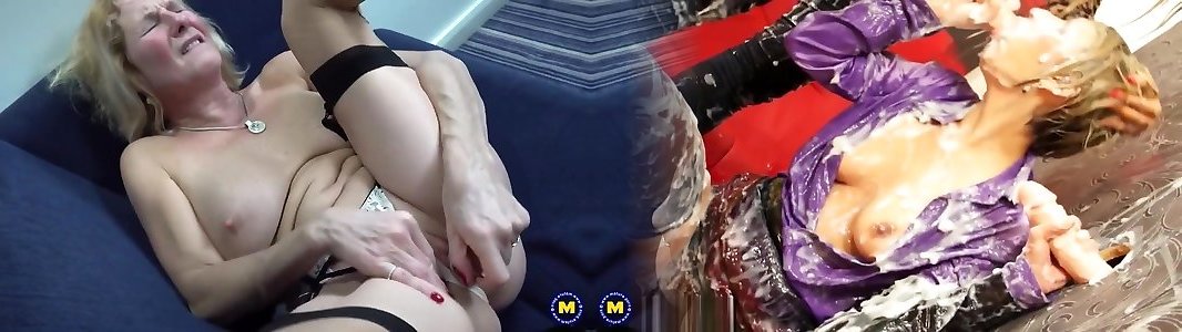 grand-mère blonde aux gros seins en collants érotiques et porte-jarretelles se masturbe avec un gode en verre