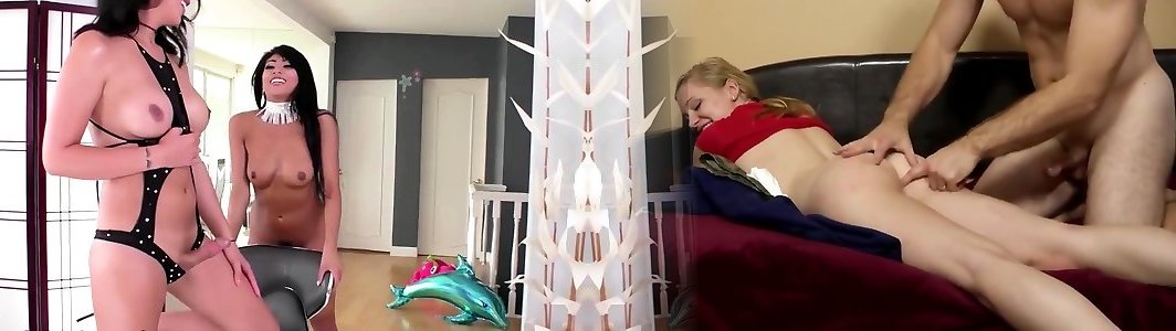 les poupées avec un sac de noix sucent des bites à quatre voies et pulvérisent des bites rigides